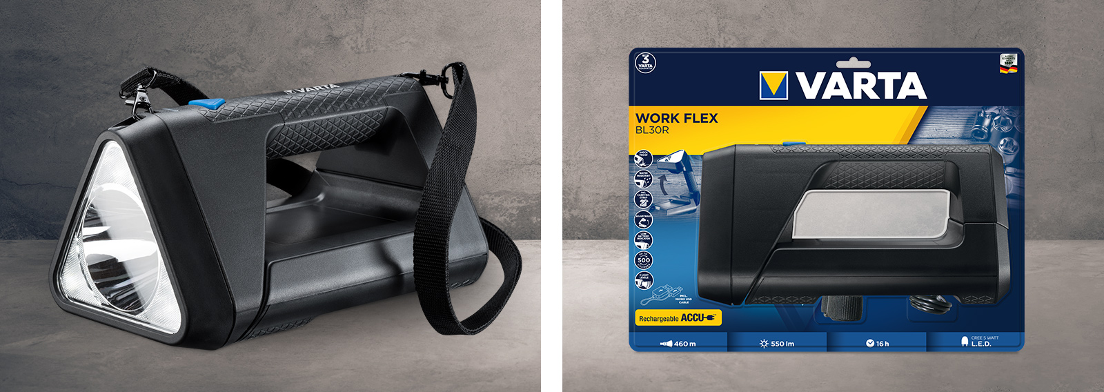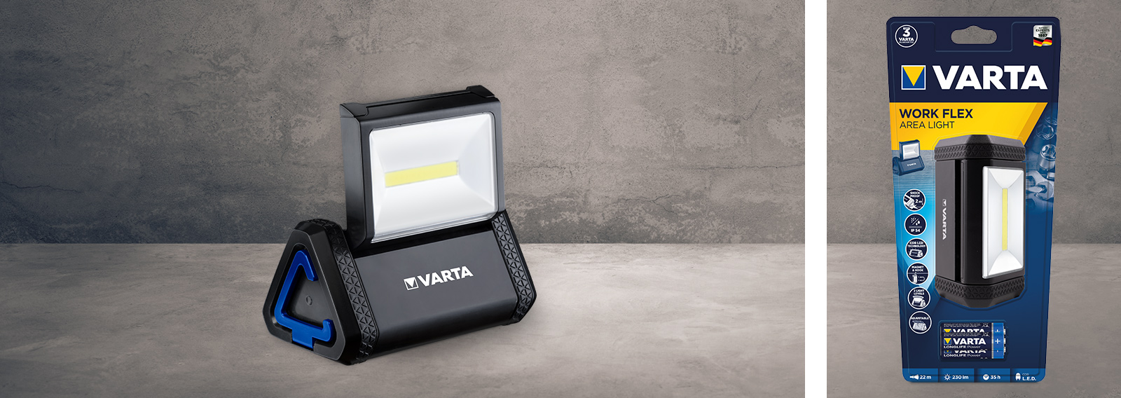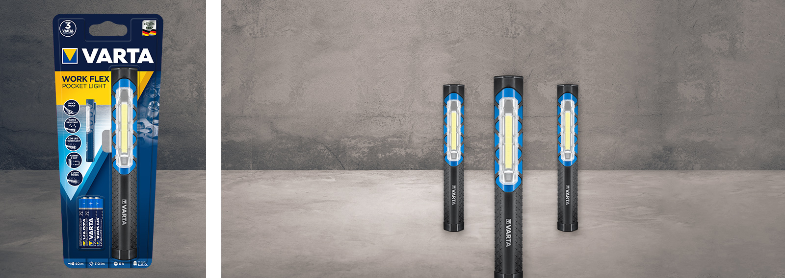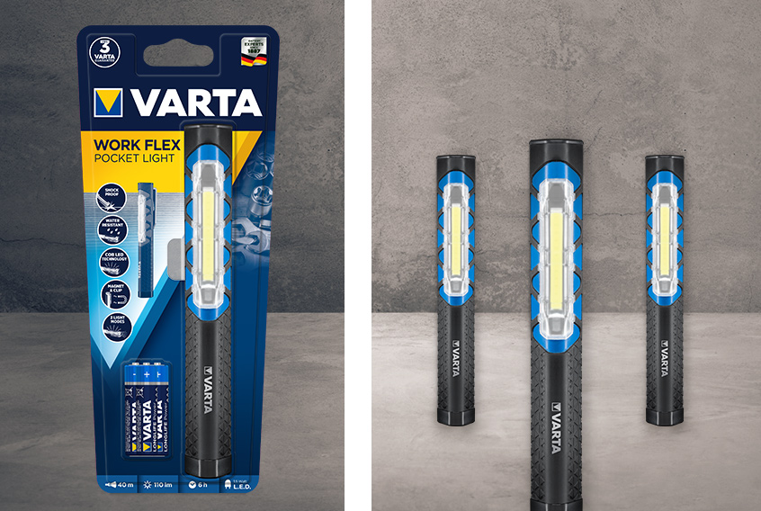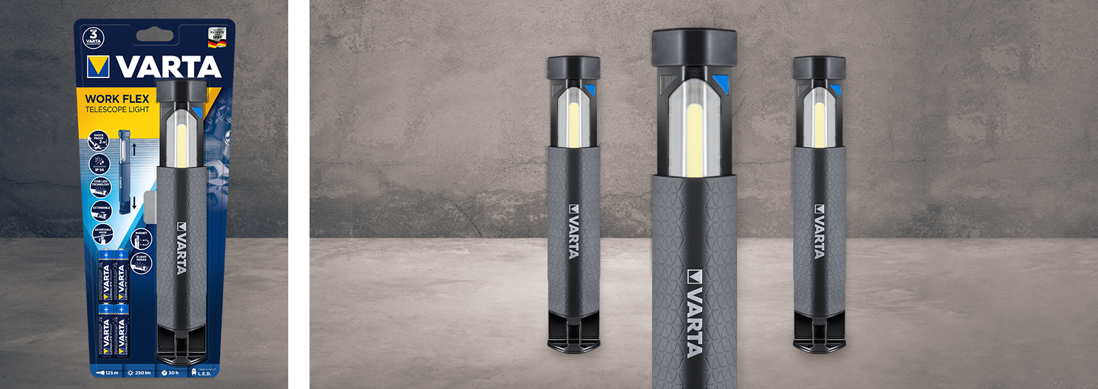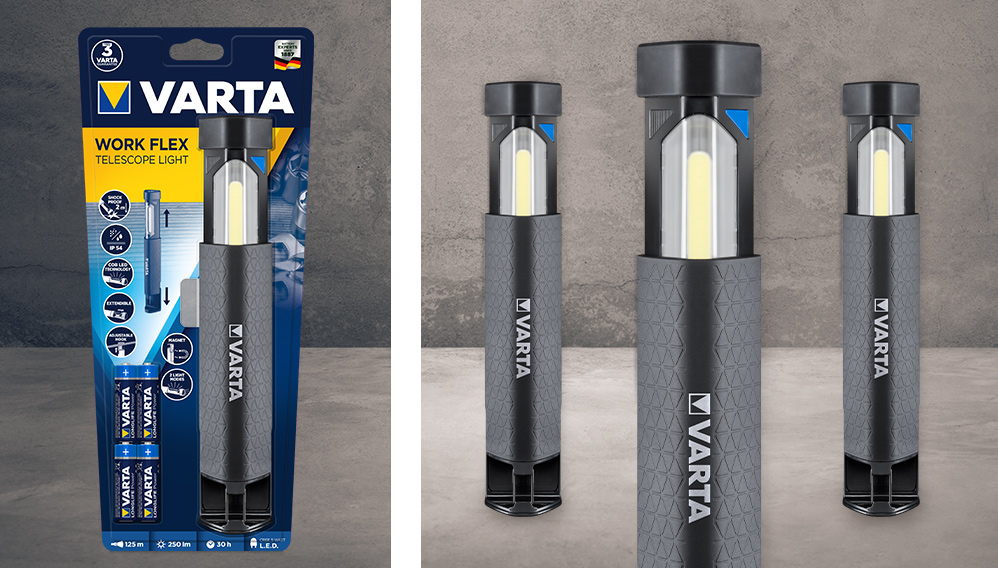 WORK FLEX Telescope Light is the versatile big brother of the WORK FLEX Pocket Light. In comparison to other products, the light from the device covers a wider area (of up to 125 m), has a luminosity of up to 250 lm and can be deployed in two different modes: Spot lighting from the lamp head and area lighting that emanates from the extendable lamp body. This makes it ideal for larger projects. As with other worklights in our range, a frosted lens prevents glare and ensures better light dispersion, while COB LED technology provides optimum illumination of the workspace. Our telescopic light can be securely attached to a variety of surfaces, leaving both hands free for working. An adjustable hook allows for particular versatility in this regard. The device is also splash-proof, dust-proof and shock-resistant (up to a drop of 2 m).