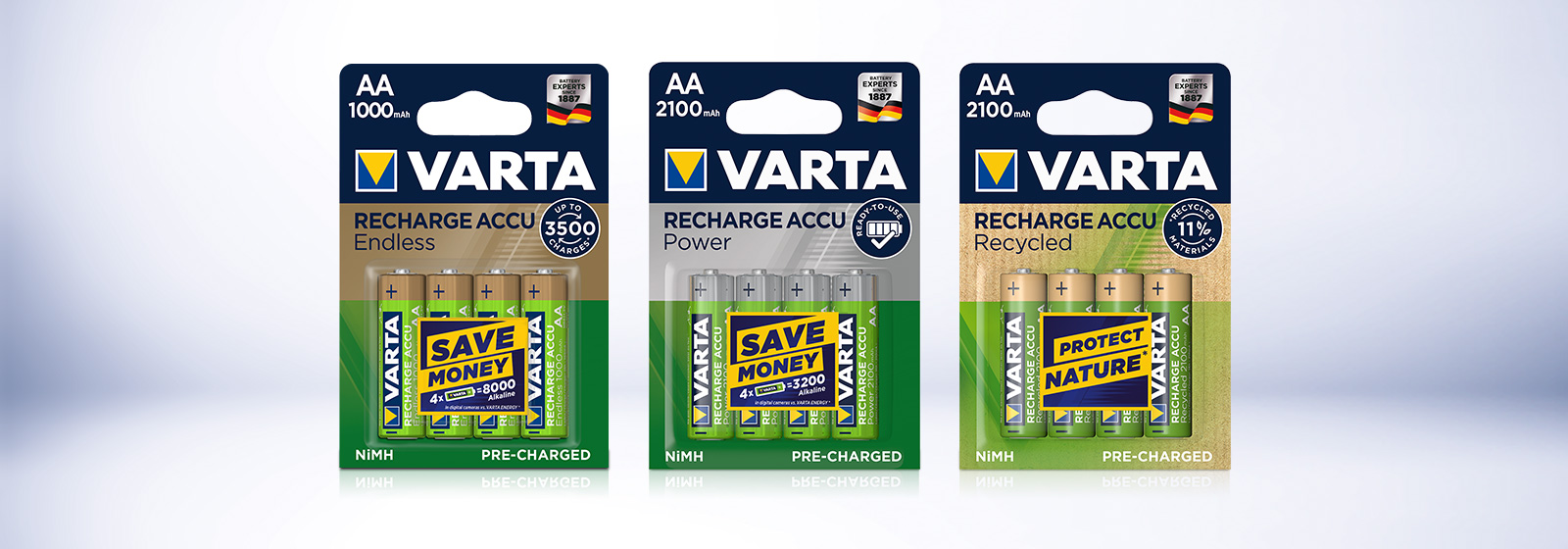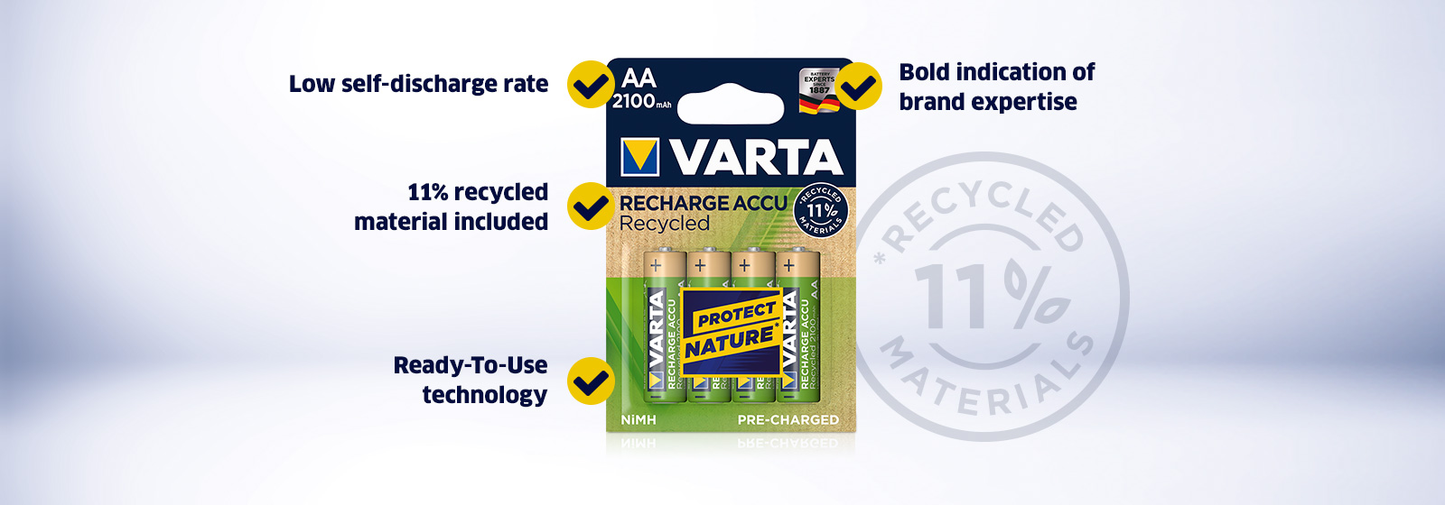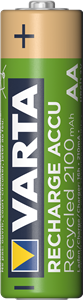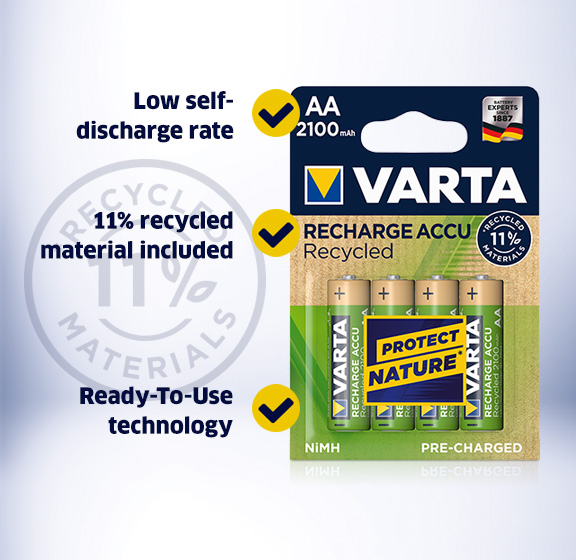 VARTA RECHARGE ACCU Recycled – The new environmentally friendly green product line in the most demanded capacities. VARTA RECHARGE ACCU Recycled is made of 11% recycled material and combines all advantages of regular rechargeable batteries like Ready-To-Use technology and low self-discharge.