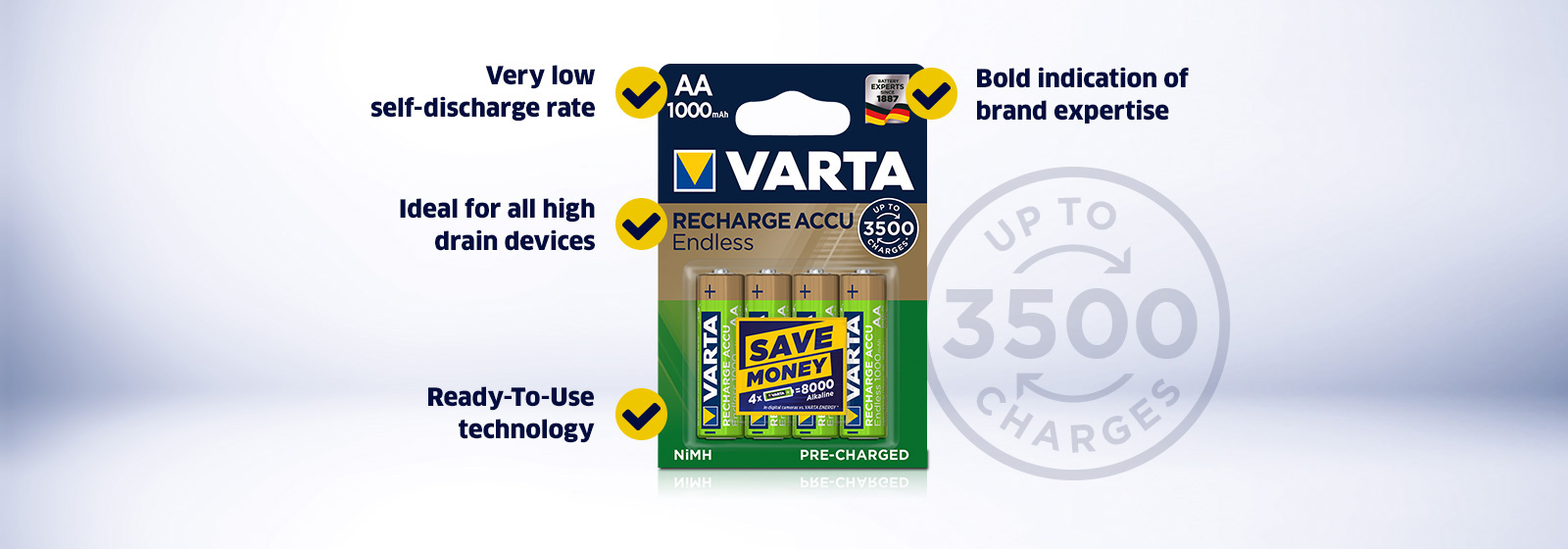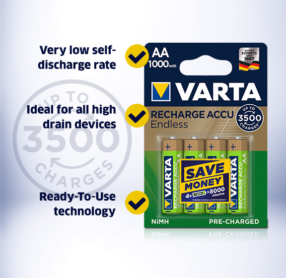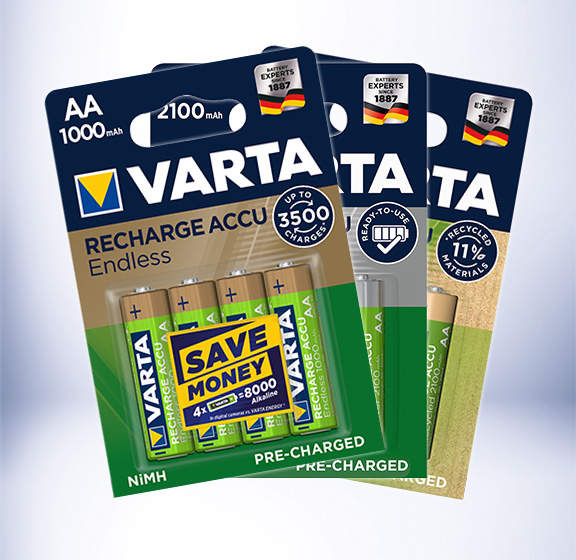 VARTA RECHARGE ACCU Endless – Experience latest and most advanced accu technology! The new money-saving product line with the highest number of charges in the most demanded capacities. This new rechargeable is especially designed for families and their kids. The VARTA RECHARGE ACCU Endless cells provide the highest number of charging cycles with up to 3500 charges per battery*, are pre-charged for immediate usage and have a very low self-discharge** – Endless power for all kind of situations and applications, where reliable sources of mobile power are needed.