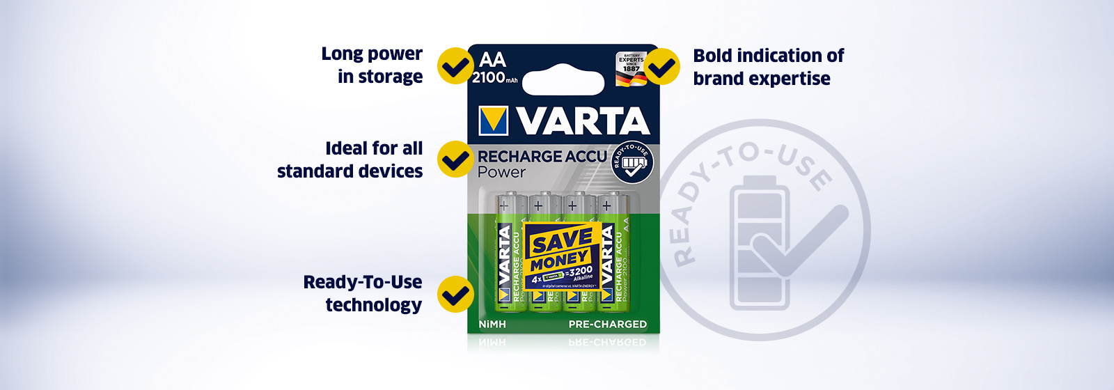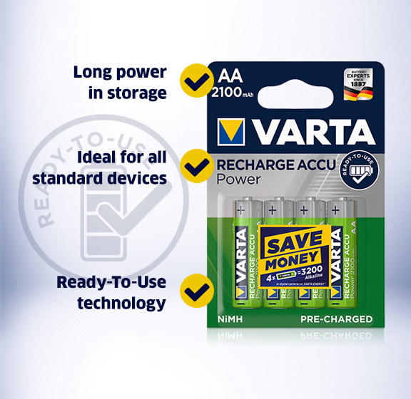 The powerful product line combines best value for money and consumer orientation. Once charged, the VARTA RECHARGE ACCU Power still retain up to 75% of their initial capacity after 12 months of storage (for AAA 1000 mAH / AA 2600 mAh up to 65%). The pre-charged batteries are perfect for daily usage and do not require a special charger.
